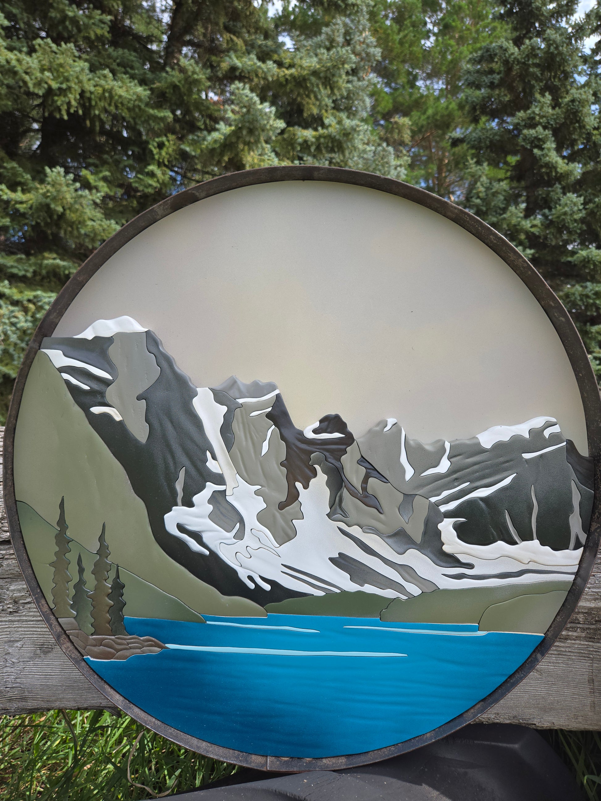 Framed with a whiskey barrel ring for a touch of rustic against the turquoise lake